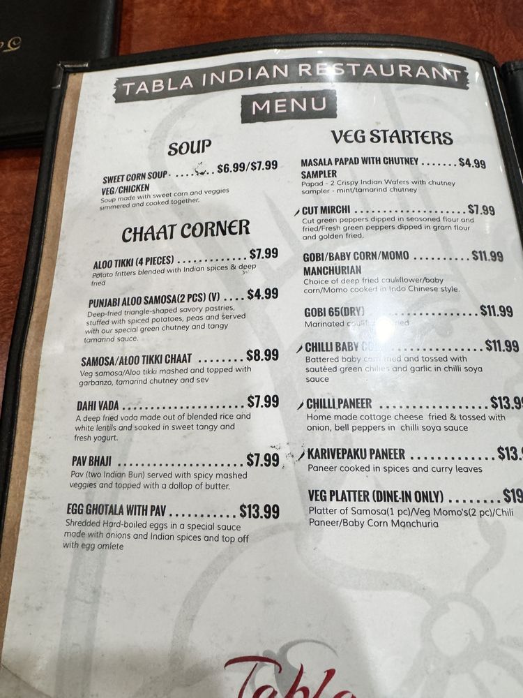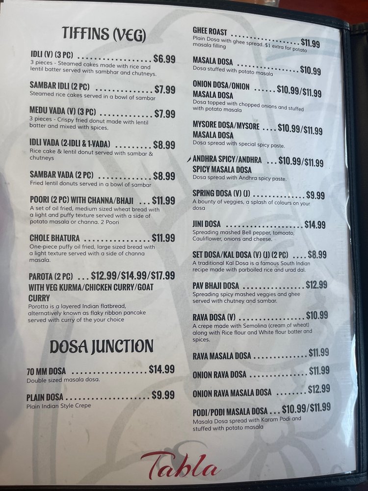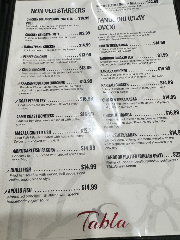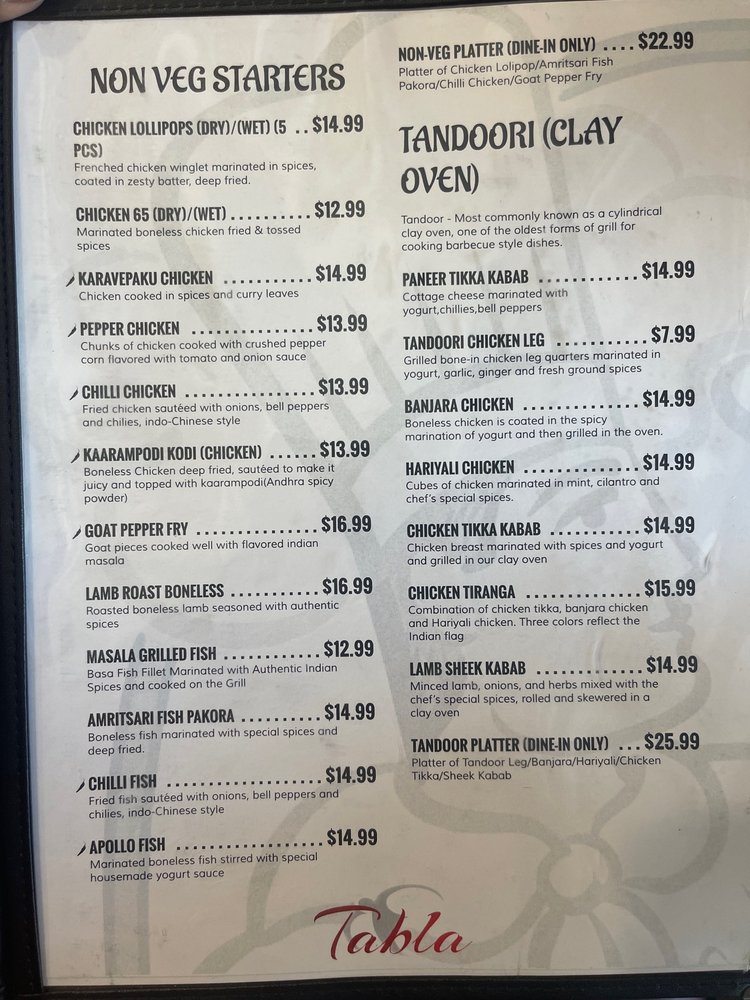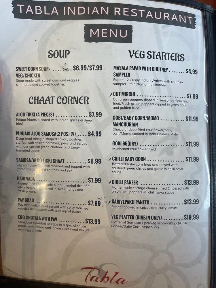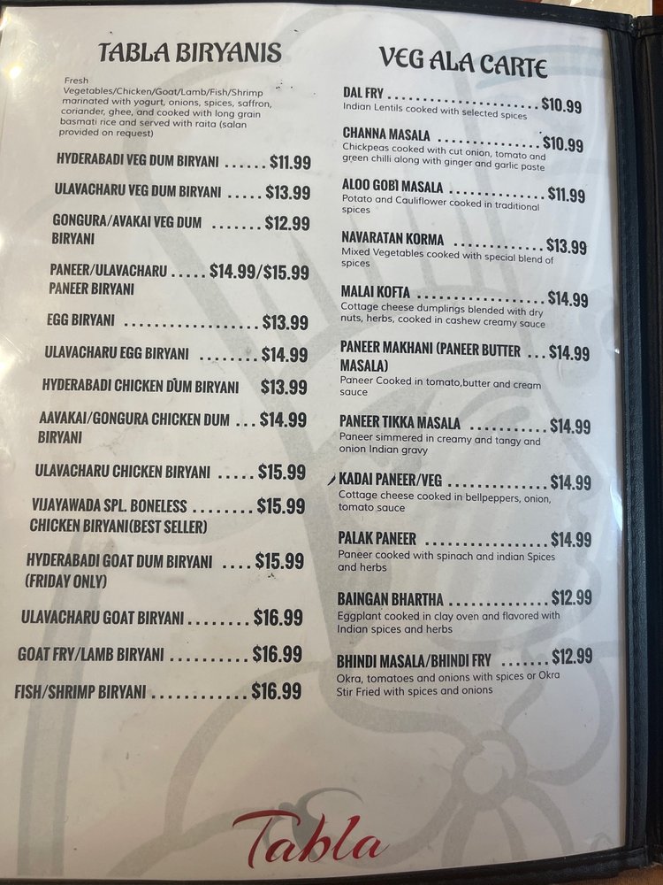 Tabla Indian Restaurant Menu
