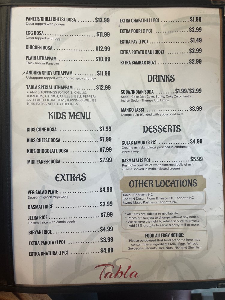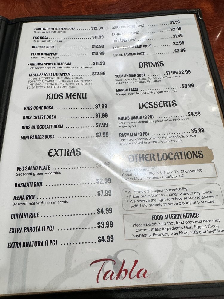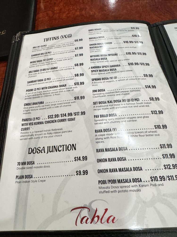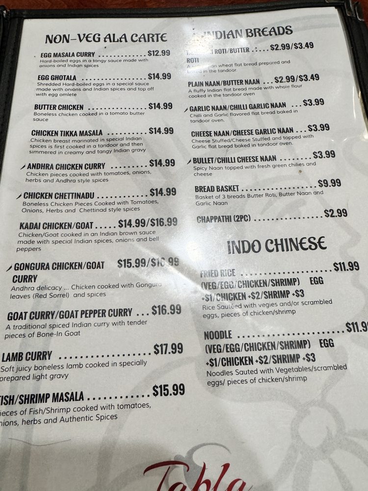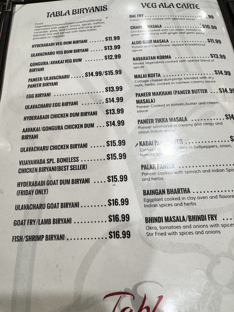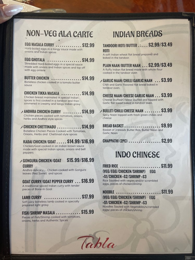 Tabla Indian Restaurant Menu